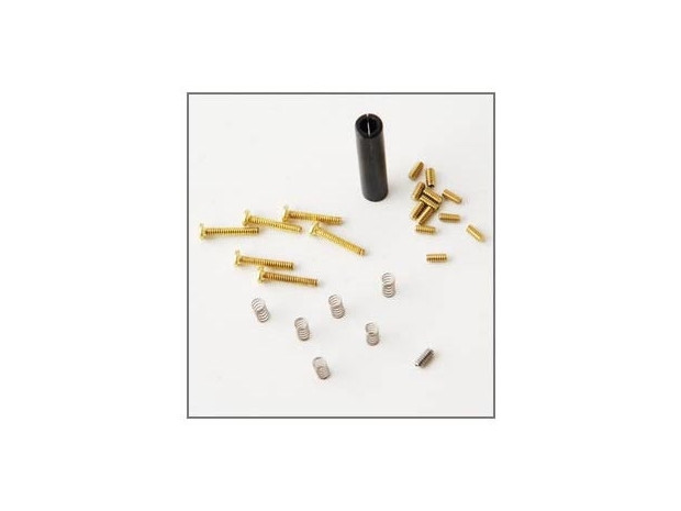 Includes all components (except saddles) for PRS Tremolo Bridge. Kit contains: 6 unplated brass intonation screws with springs, 12 saddle height screws, 1 tremolo arm bushing, 1 stainless steel bushing screw. Only available as unplated brass. (Only compatible with US-made models)(Please note: The parts assembled in this kit are NOT offered individually.